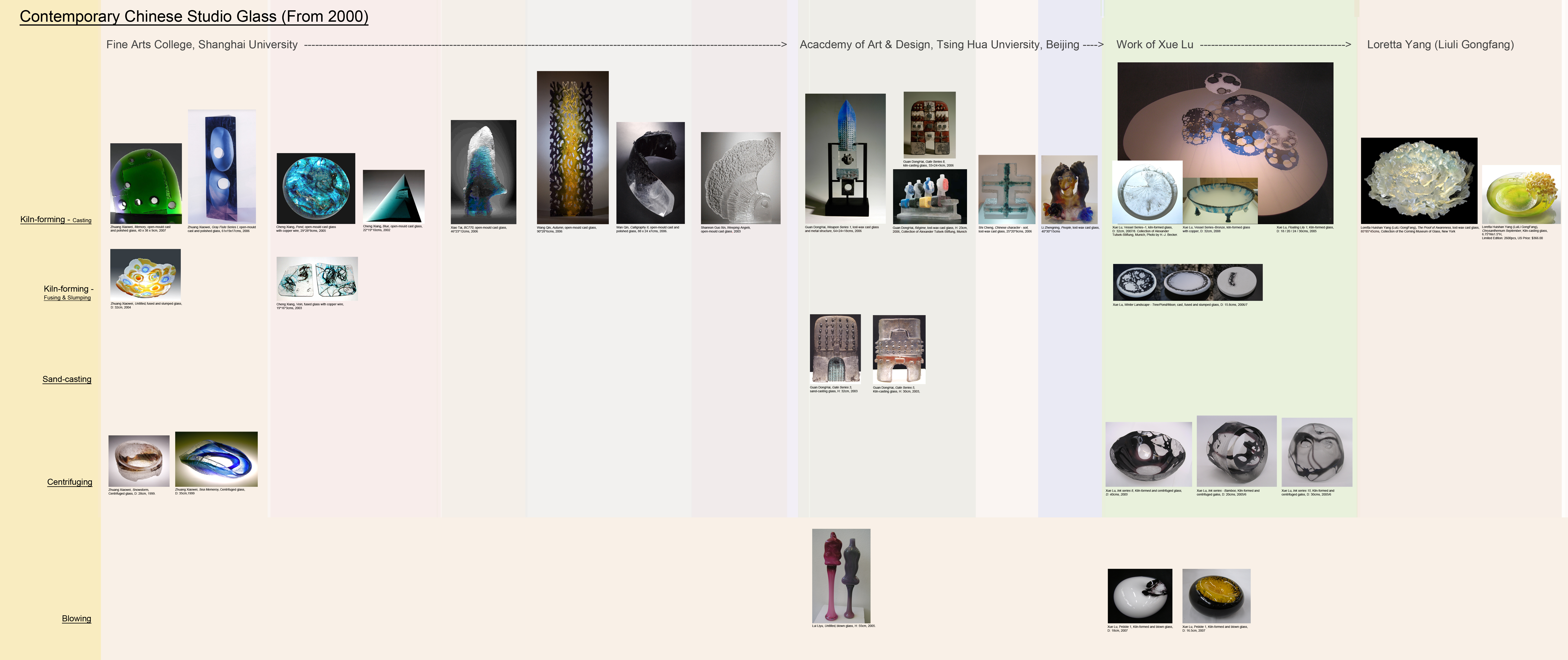 This thesis is an investigation into the development of glass as an expressive medium in China through direct contact with Western methods of making, decoration and forming glass. The investigation proceeds through an analysis of the parallels between glass objects produced from Kangxi (1662-1722) to Qianlong period (1736-96), and contemporary practitioners’ (2000-2009), which is complemented by my own practice. The investigation mainly looks at three aspects and their inter-relationship within these strands. They are: 1) the history of glassmaking from 1696 to 1795 in the Qing dynasty with Western influences; 2) the analysis of Contemporary Chinese studio/academic glass within the imported UK model; 3) the development of my personal glass practice within this matrix. Practical work is of two components: reproductions of historical examples and personal creative pieces. The inter-relationship/comparison between these three strands seeks to identify themes, such as the influence of the imported models, reactions to them (the nature of hybrid), and the development of Chinese identity within glassmaking. The purpose is to draw similarities and differences from the comparisons in terms of philosophy, attitude, cultural reference and technique, between Qing and contemporary China, to provide general principles in practice and guidance for future development. Basic information has been gathered from a wide range of sources both in China and in the UK using libraries, museums and galleries / literature from books, journals, archives and websites. Some information has been derived from direct contact (emails, interviews, conversations and questionnaires) with practitioners and scholars. The nature of the research has involved the examination of real historical objects and their technical repetitions, visits to Chinese Universities and personal exhibitions. These investigations included the identification of almost all of the extant examples of the Qing dynasty and their examination in terms of the identified aims of the research, especially in terms of physical evidence within the objects themselves. A body of personal work has also been developed and presented as a case study and used as an investigative tool for analysing the contemporary movement and the making of suggestions. The techniques addressed in this research were developed as examples to illustrate the diverse possibilities of practice. The whole study has been complemented by practice, the outcome of the research naturally consisted of a written thesis and a body of personal work. The written part contains the interpretation of contemporary Chinese studio glass and the analysis of its actual influences from Western practice. Furthermore the comparison of historical experiences is given through the viewpoint of a glass practitioner. A series of similarities and differences and the experiences from other practical models (Western Studio Glass Movement) have been illustrated from the comparison, as well as a set of recommendations and a vision for future development in China. The use of visuals, including image comparisons, technical and process illustrations, drawings, videos and actual samples, are designed to give new insights on the research of Chinese glass and provides an added dimension for presenting and encouraging discourse within the research of Art & Design. Additionally, a comprehensive appendix at the end of the thesis records almost all of the existing Qing glass objects while concentrating on the highest quality of the same category both in and out of China. Further information on relative exhibitions, publications and contact lists are useful for those who are willing to pursue a further study.